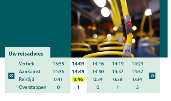 Als je goed kijkt zie je onder zijn vertrektijd staan dat de reis met de bus 46 minuten duurt. In de opgave staat echter nog vermeld dat hij ook nog 23 minuten zal moeten lopen.